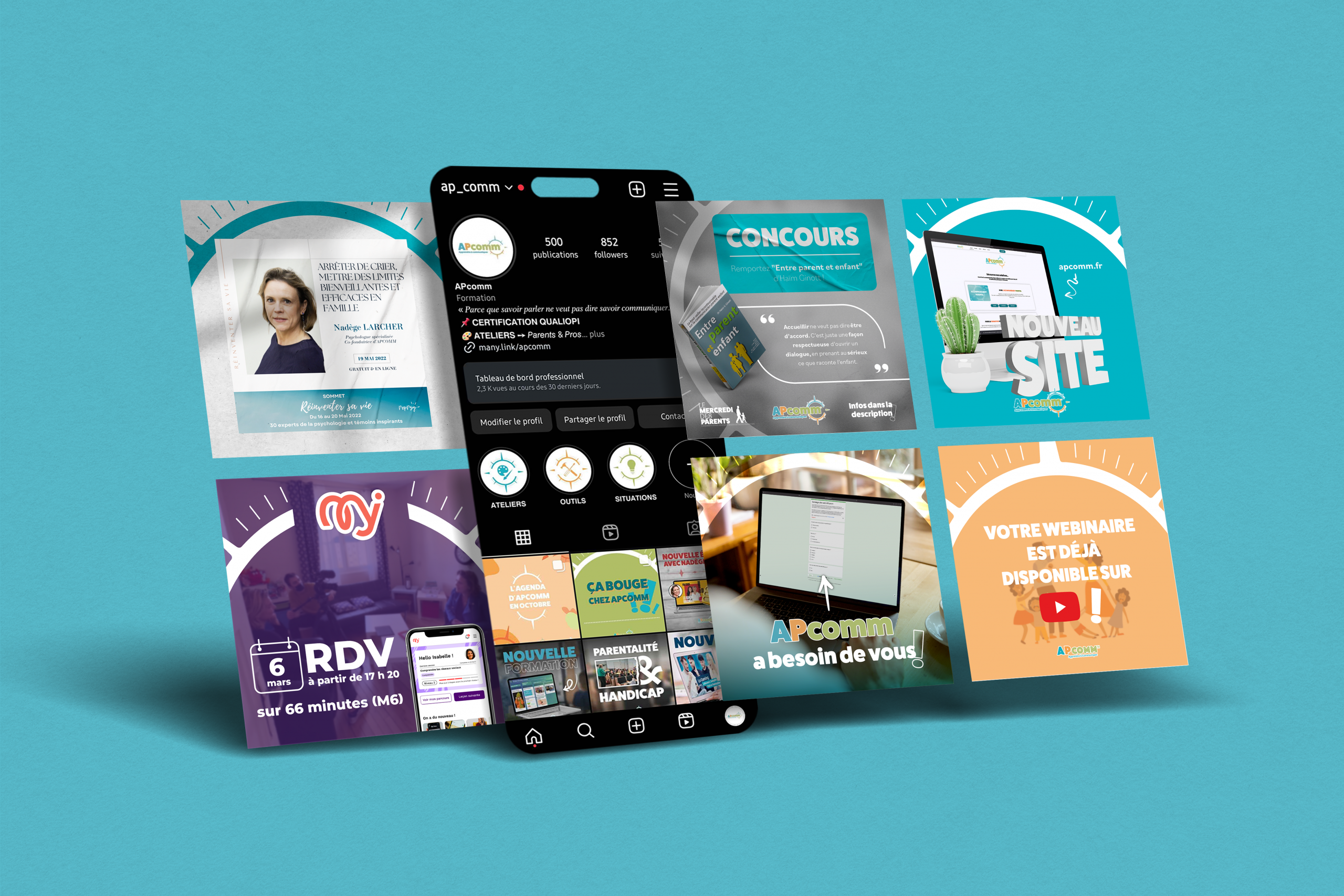Création permanente de visuels, avec un rythme de 3 à 4 posts par semaine ; anticipation du calendrier des publications d'un mois à l'autre